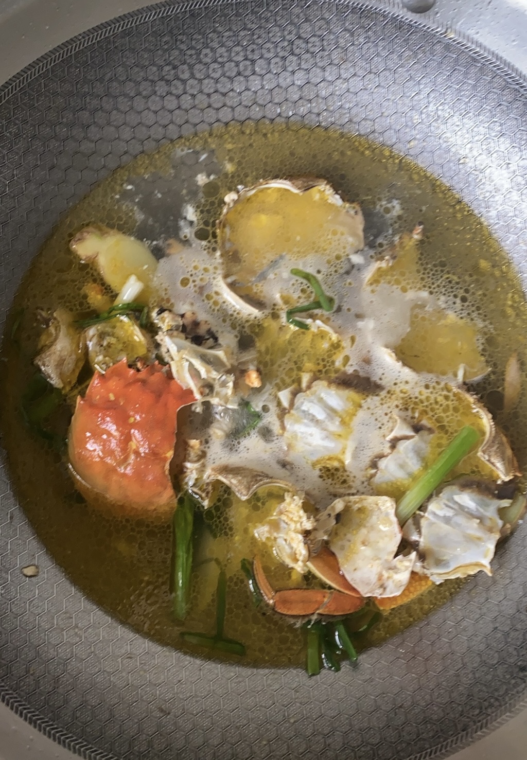 - 做蟹黄高汤:起锅烧油,放入姜葱,放入螃蟹的蟹壳和边角料,炒出蟹油,加盖过食材的开水,熬煮5-10分钟过滤,得到蟹黄高汤。