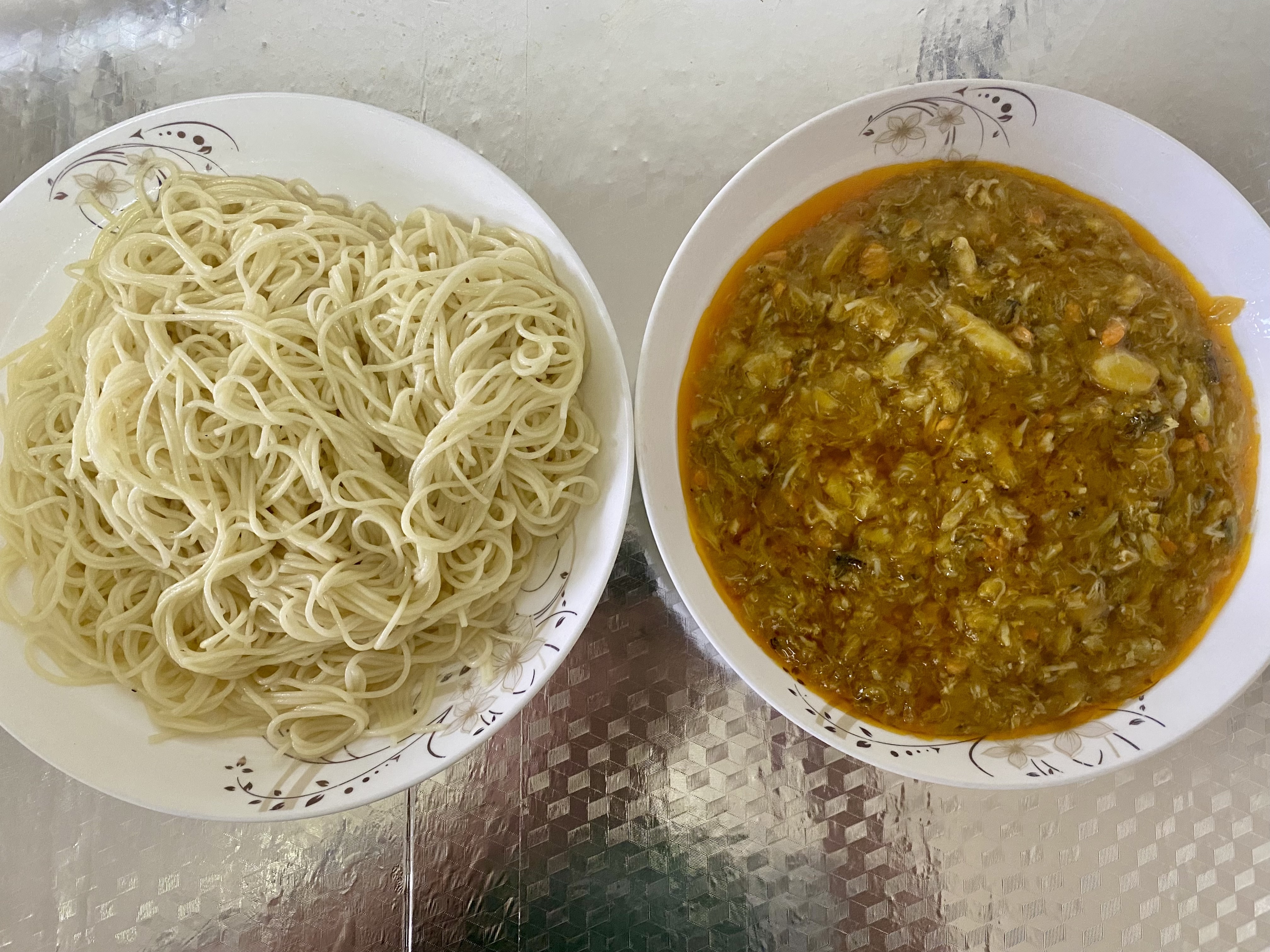 - 煮面:蟹黄拌细面口感较好,蟹粉本身有点腻,加点醋一起搅拌更加鲜香。